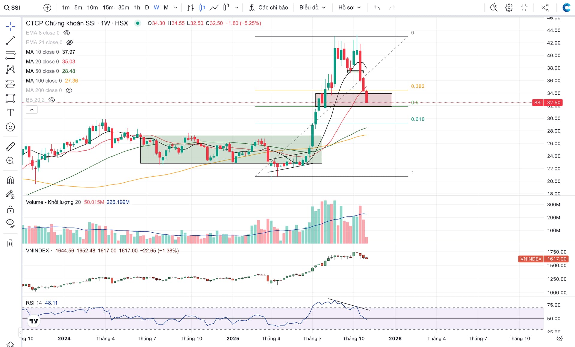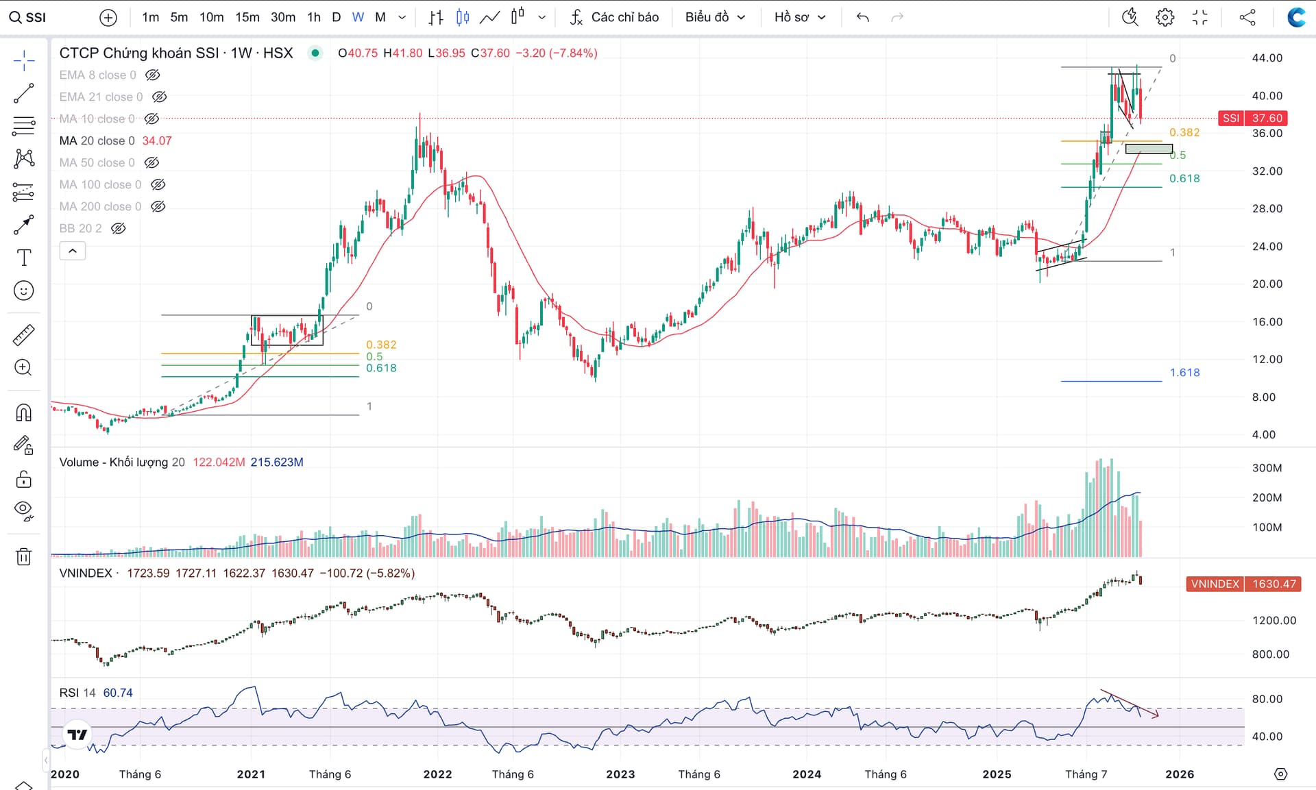 Cp SSI cũng đã có cấu trúc tạo phân kỳ đỉnh rồi, Ma 20 chart Tuần là cái cp hướng tới