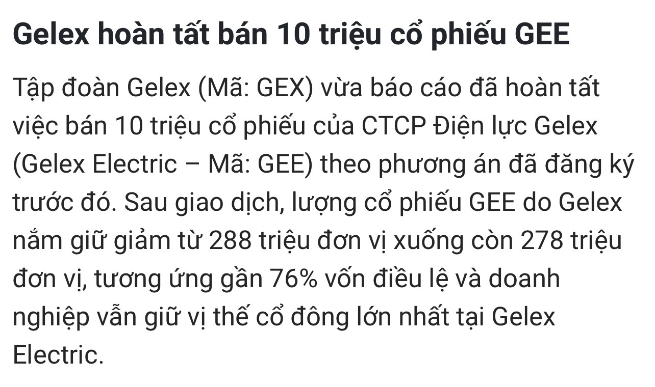 GEX đã bán xong 10t cp GEE để thu về 1.800 tỷ như KH: