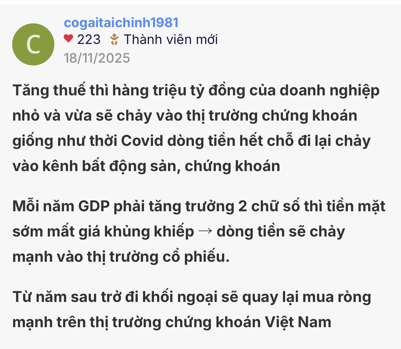 Thực trạng kinh tế Việt Nam đang nát bét các ông chiên chứng chỉ đọc báo đâu có biết tình hình thực tế ngoài xã hội. Trên các diễn đàn đám đông kẹp hàng vẫn đang hô hào bắt đáy rất đông thế thì còn lâu mới có đáy. VNI giảm về 1000 điểm thì may ra có đáy. Con VIC tính ra chỉ mới giảm chút xíu. Qua ngày 19/12 khởi công các dự án mục đích chỉ để LẤY THÀNH TÍCH xong thị trường sập mất thanh khoản đặc biệt nhóm Vin sập mạnh. Rất nhiều cổ phiếu giá hiện tại vẫn x2, x3, x4, x6 còn phải giảm nhiều.