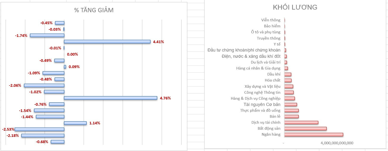 - Còn lại, VNMidcap -1,24% và VNSmallcap -1,16% khi áp lực bán đẩy mạnh ở nhóm Bất động sản, Chứng khoán, Hóa chất, Thép – Tôn mạ, Thực phẩm đồ uống. Điều này thể hiện qua phiên điều chỉnh của NKG giảm sàn, PDR (-5,1%), VCI (-3,6%), MSN (-3,3%).