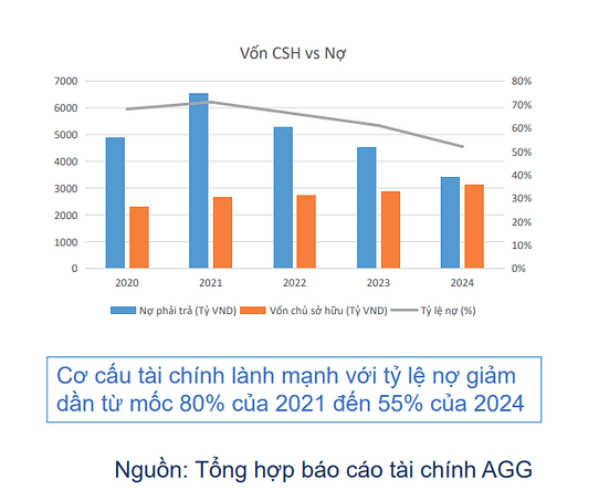 - Cơ cấu tài chính vững vàng: AGG có tỷ lệ nợ/vốn chủ sở hữu giảm từ 80% (2021) xuống 55% (2024), cho thấy cơ cấu tài chính lành mạnh. Điều này giúp AGG có dư địa tài chính để triển khai các dự án lớn như The Gió.