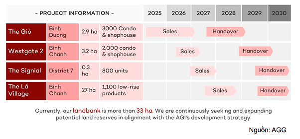 - Quỹ đất mở rộng: AGG hiện sở hữu quỹ đất đang triển khai >33 ha, với các dự án khác như Westgate 2 (2.000 căn, 2025-2026), The Signial (800 căn, 2027-2028), và The La Village (1.100 sản phẩm thấp tầng, 2027-2029), tạo động lực tăng trưởng dài hạn.