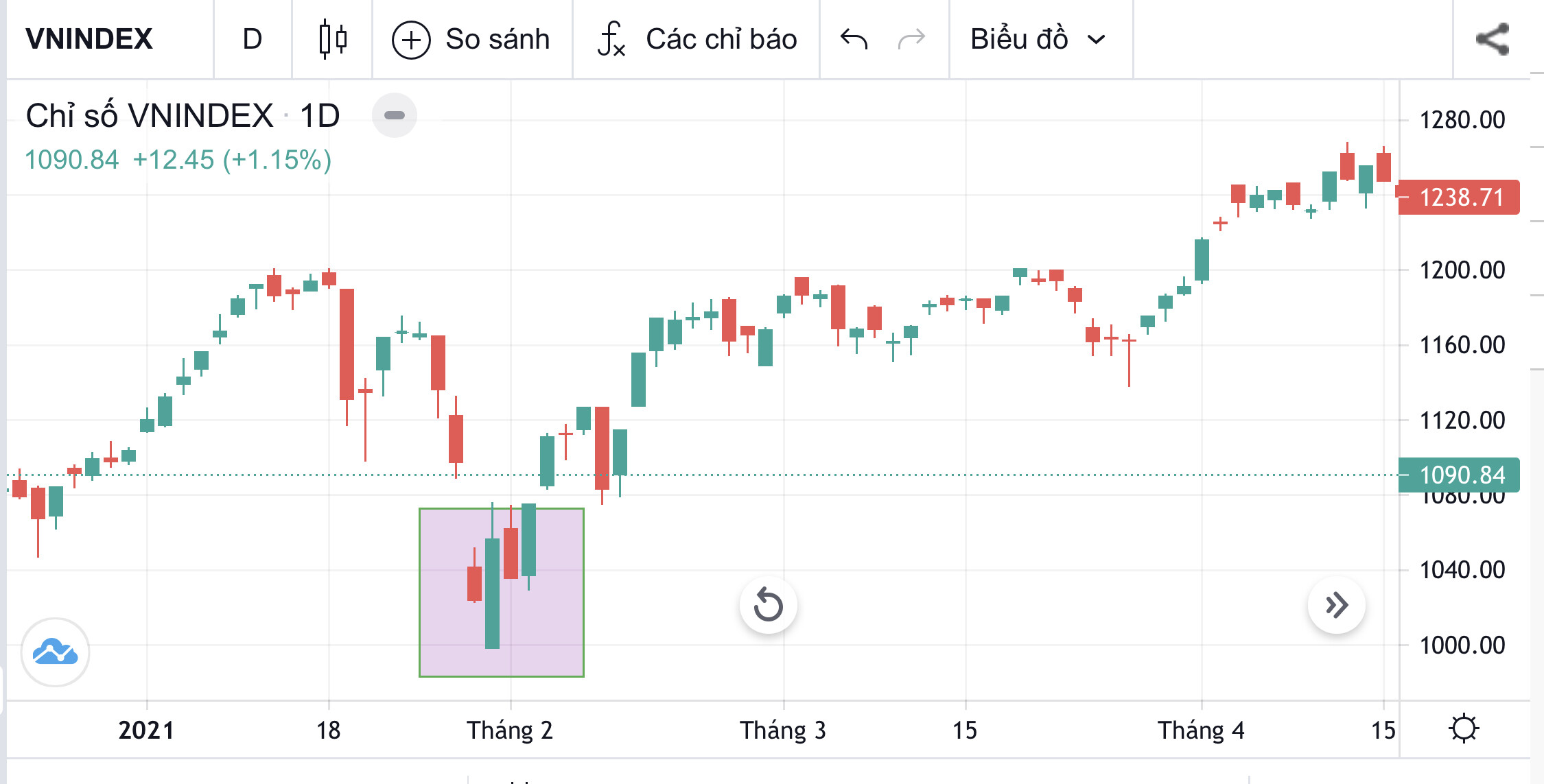 Rất thú vị là đầu tháng 2/2021, VNI cũng tạo hòn đảo đảo chiều ở đáy (tương đương điểm số hiện tại) để tăng lên vùng 1.500 điểm: