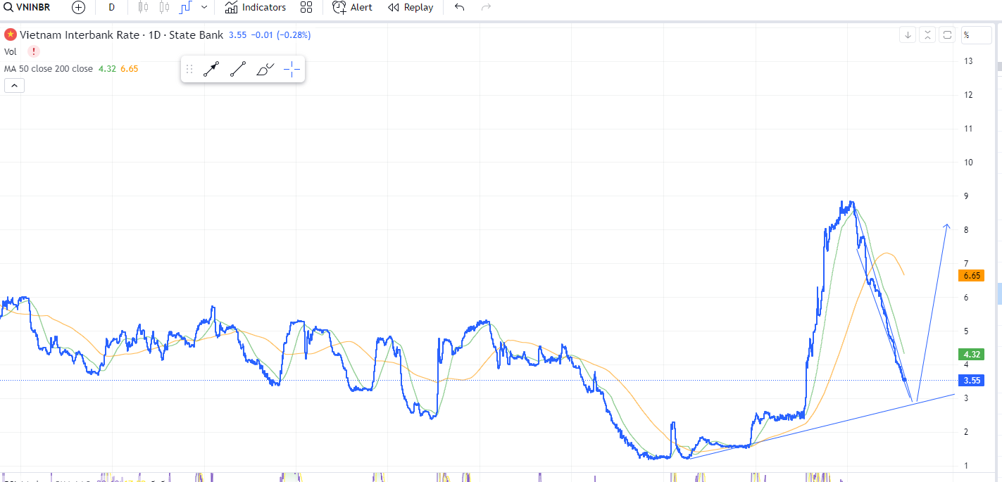 Trong quá khứ đã rất nhiều lần lãi suất qua đêm giật lên và giật xuống. LS qua đêm chắc chắn sẽ hồi lên tạo đỉnh 2.