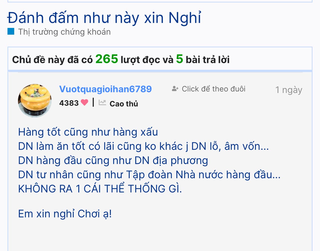 em thì ko magin lên cũng ko quan tâm lắm.kk cơ mà sang nay cụ nào nhặt zép là ấm rồi ăn 10% ngành ck.kkkk