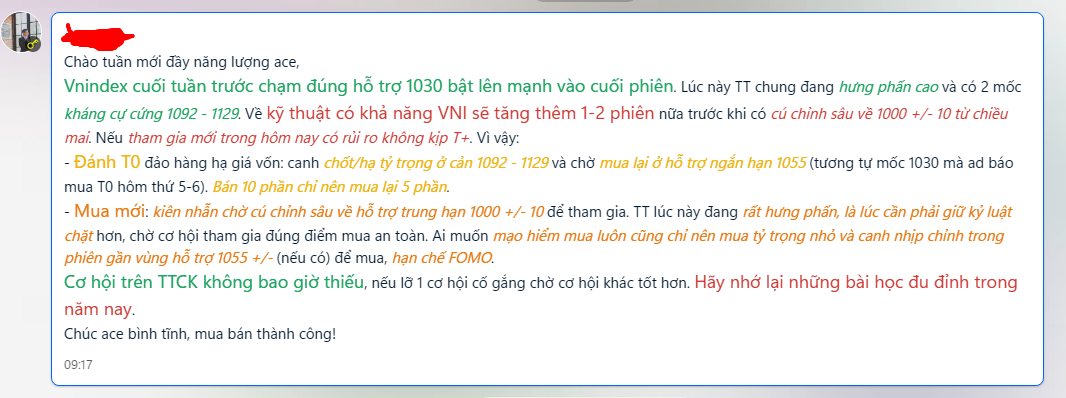Khi VNINDEX tiến về vùng 1100 chắc chắc sẽ có áp lực chốt lời, vì là phiên đầu tuần nhiều NDT mở mua quyết luyệt vào phiên sáng do cộng hưởng tâm lí từ thứ 6 tuần trước nên để đánh giá thực tiễn VNINDEX cần quan sát thêm vào phiên sáng xem tiền có duy trì đc đến trưa và chiều không?
