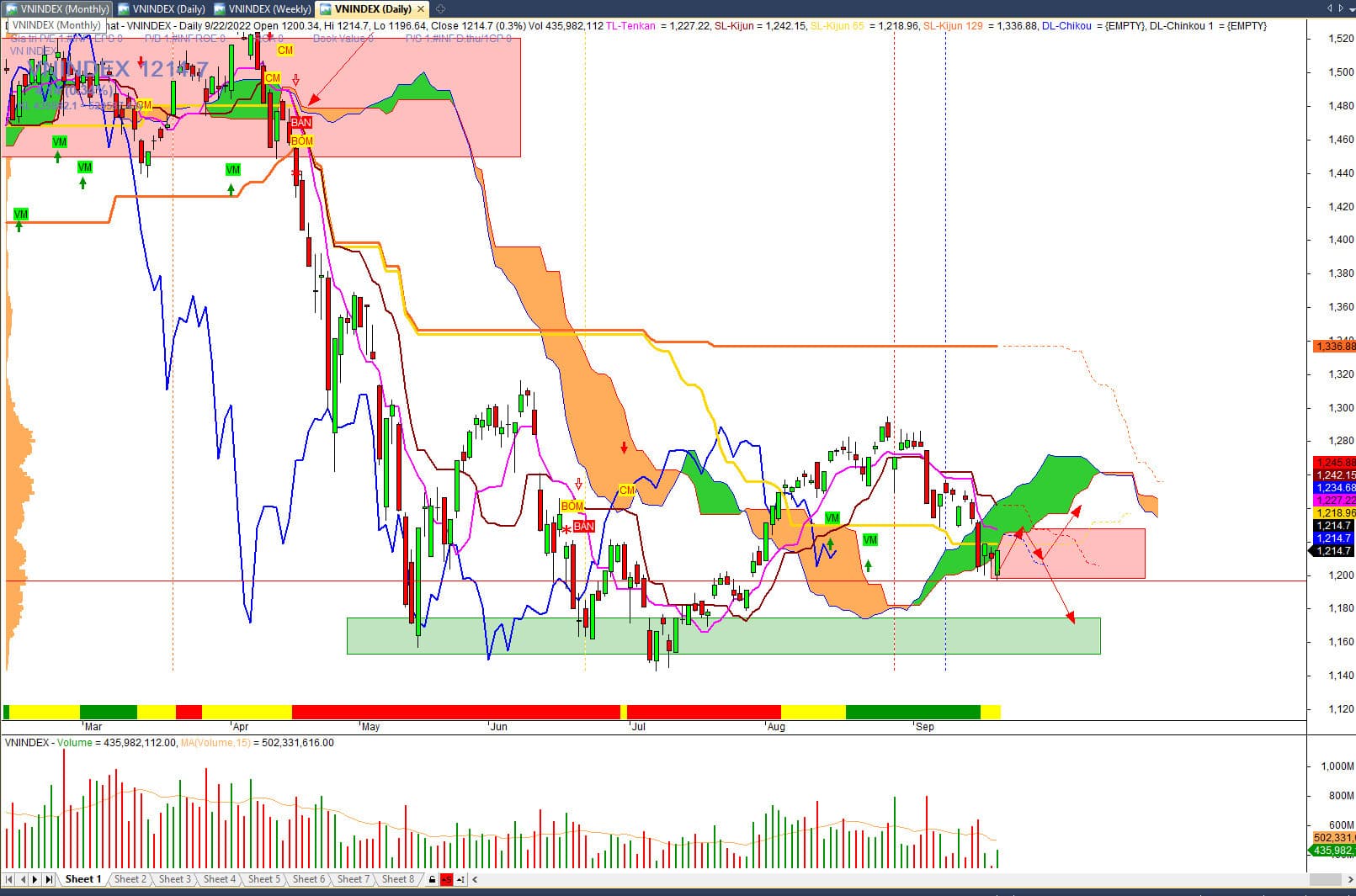 Ngắn hạn VNINDEX đang rung lắc tích lũy quanh biên độ hỗ trợ quanh 1200 kháng cự 1230. Động lực bật hồi phiên nay từ các nhóm cổ phiếu vốn hóa tầm trung như Dầu khí, Chứng khoán, Hóa chất, VLXD. Các nhóm cổ phiếu trụ vốn hóa lớn như Bank, BĐS bật tăng nhẹ, thanh khoản và lực cầu vẫn còn hạn chế cho thấy dòng tiền vẫn tương đối rụt rè giai đoạn hiện tại. Bên cạnh đó với diễn biến chứng khoán thế giới căng thẳng trong ngắn hạn với thông tin FED tăng lại suất, tiếp đến thông tin NHNN Việt Nam tăng lãi suất điều hành 1% bắt đầu tư ngày mai cũng là yếu tố khó khăn VNINDEX giai đoạn hiện tại. Dự kiến VNINDEX tiếp tục rung lắc tích lũy trong biên độ 1200-1230 trong những phiên tới.