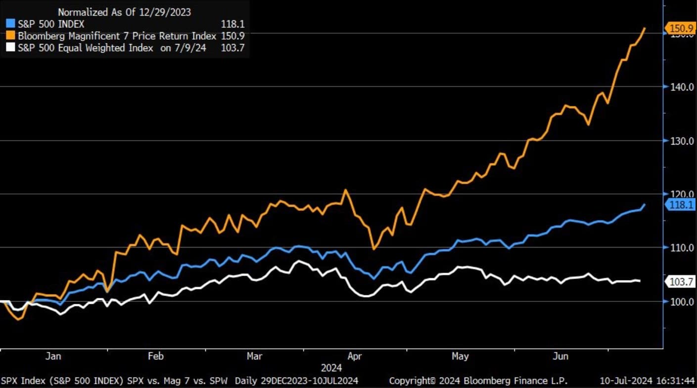 Đây chắc chắn là một trong những mức độ tập trung lớn nhất trong lịch sử thị trường chứng khoán. Chỉ một số ít cổ phiếu thúc đẩy đà tăng của S&P 500.