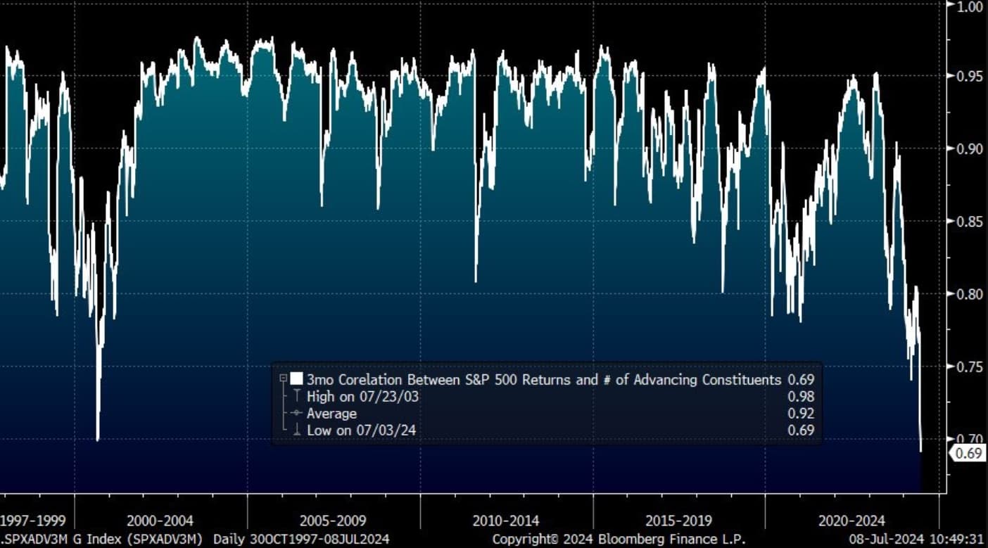 Mối tương quan trong 3 tháng giữa lợi nhuận của S&P 500 và số lượng cổ phiếu tăng giá của S&P 500 đã giảm xuống mức THẤP NHẤT trong lịch sử.
