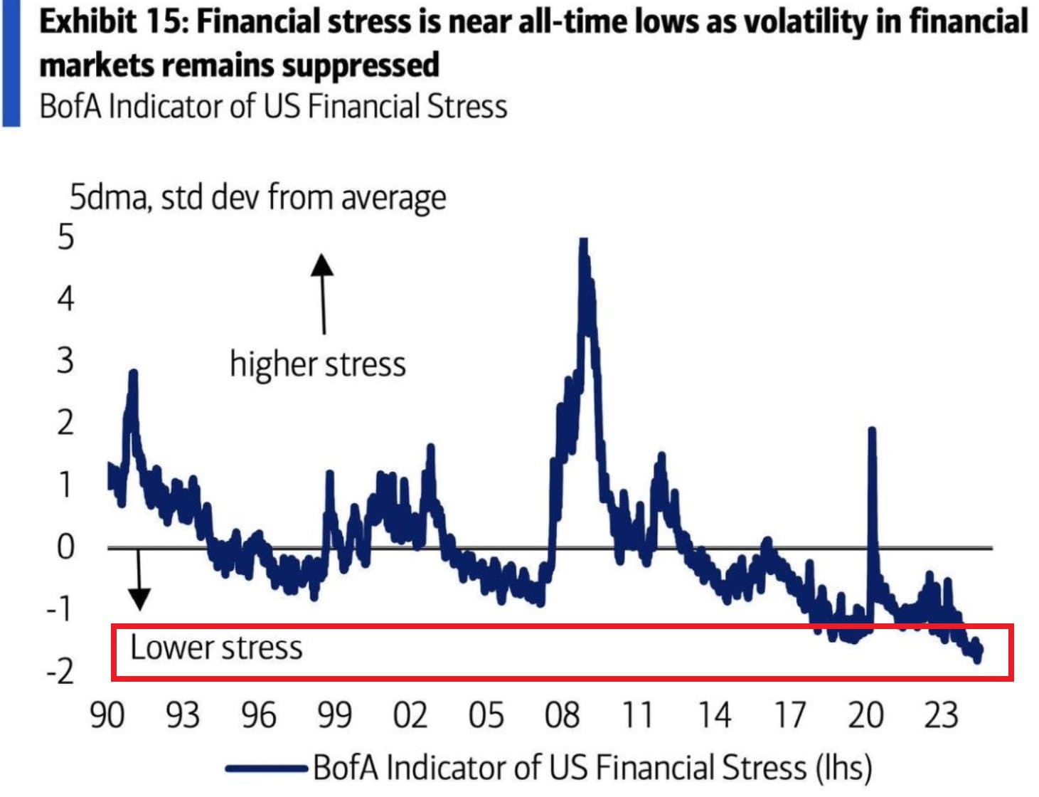 Căng thẳng hệ thống tài chính Mỹ đang ở gần mức thấp nhất mọi thời đại khi sự biến động trên thị trường tài chính giảm xuống một trong những mức thấp nhất được ghi nhận.