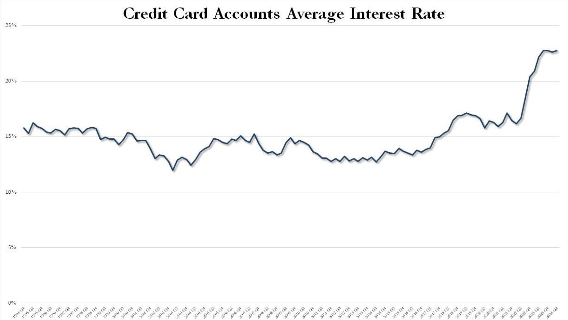 5) Cuối cùng, lãi suất trung bình thẻ tín dụng của Mỹ đã đạt 22.76% trong quý 2 năm 2024, một kỷ lục mọi thời đại.