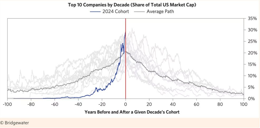 10 cổ phiếu hàng đầu của Mỹ hiện chiếm ~30% tổng giá trị thị trường chứng khoán.