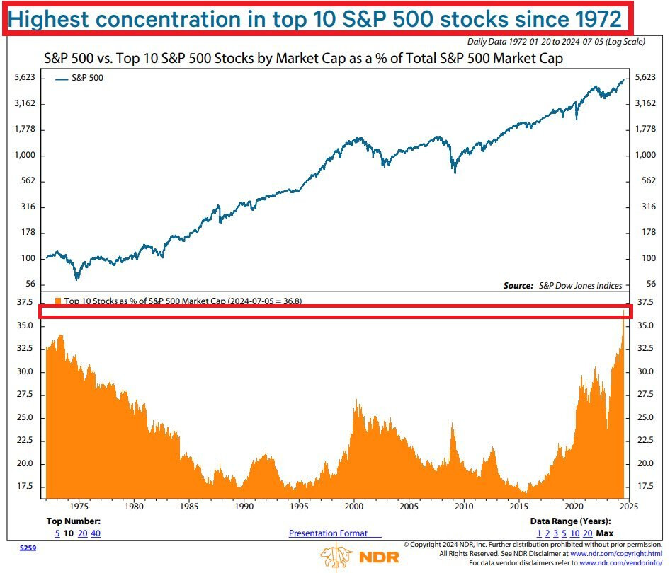 10 cổ phiếu hàng đầu thuộc S&P 500 hiện chiếm ~37% vốn hóa thị trường. Đây là tỷ lệ cao nhất kể từ năm 1972.