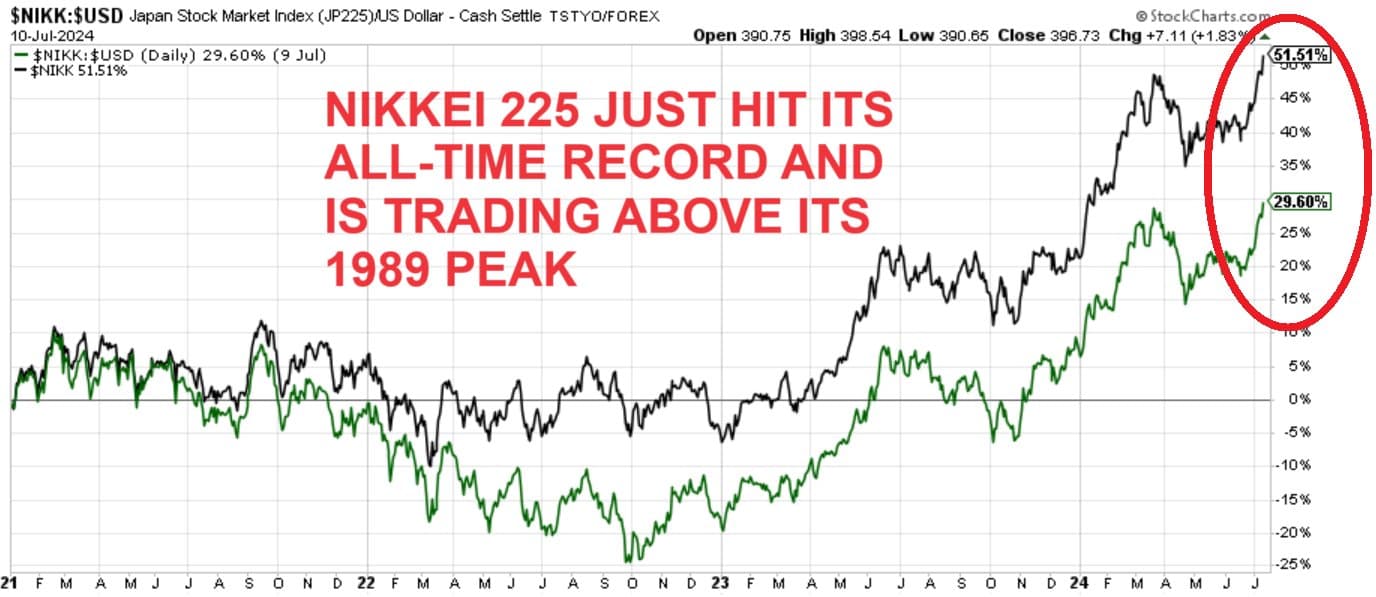 Chỉ số Nikkei 225 của Nhật Bản vừa đạt mức cao nhất mọi thời đại và đang giao dịch cao hơn mức đỉnh năm 1989.