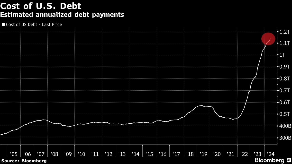 3) Chi phí lãi vay hàng năm của Mỹ đối với nợ công vừa đạt mức khổng lồ 1.15 nghìn tỷ USD, mức cao nhất mọi thời đại.