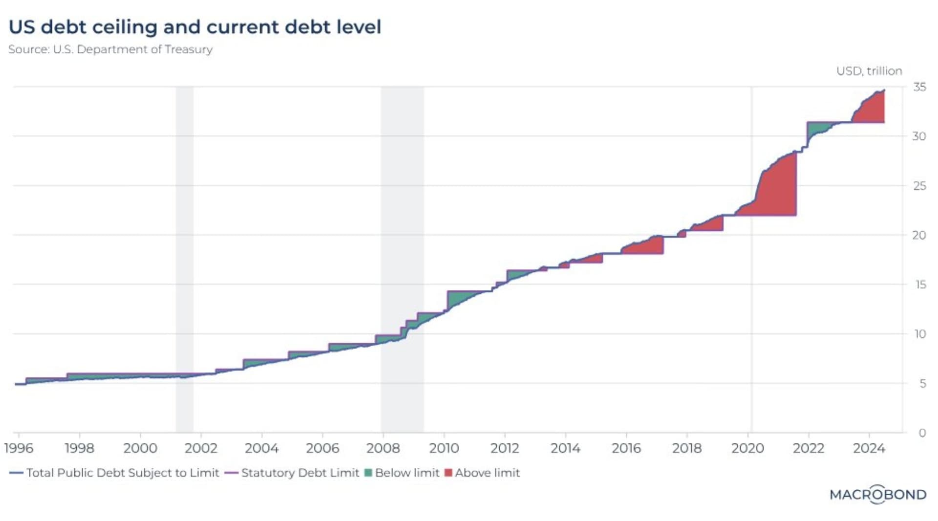 Trong khi đó, nợ công của Mỹ đang ở mức kỷ lục lịch sử là 34.8 nghìn tỷ USD. Con số này cao hơn 3.4 nghìn tỷ USD so với mức trần nợ công 31.4 nghìn tỷ USD đã bị đình chỉ cho đến tháng 1 năm 2025.