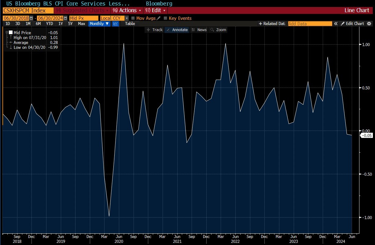 Thước đo yêu thích của Fed là CPI lõi không bao gồm nhà ở đã giảm 0.05% so với cùng kỳ năm trước trong tháng 6 và giảm 0.04% so với cùng kỳ trong tháng 5, mức âm đầu tiên kể từ năm 2021.