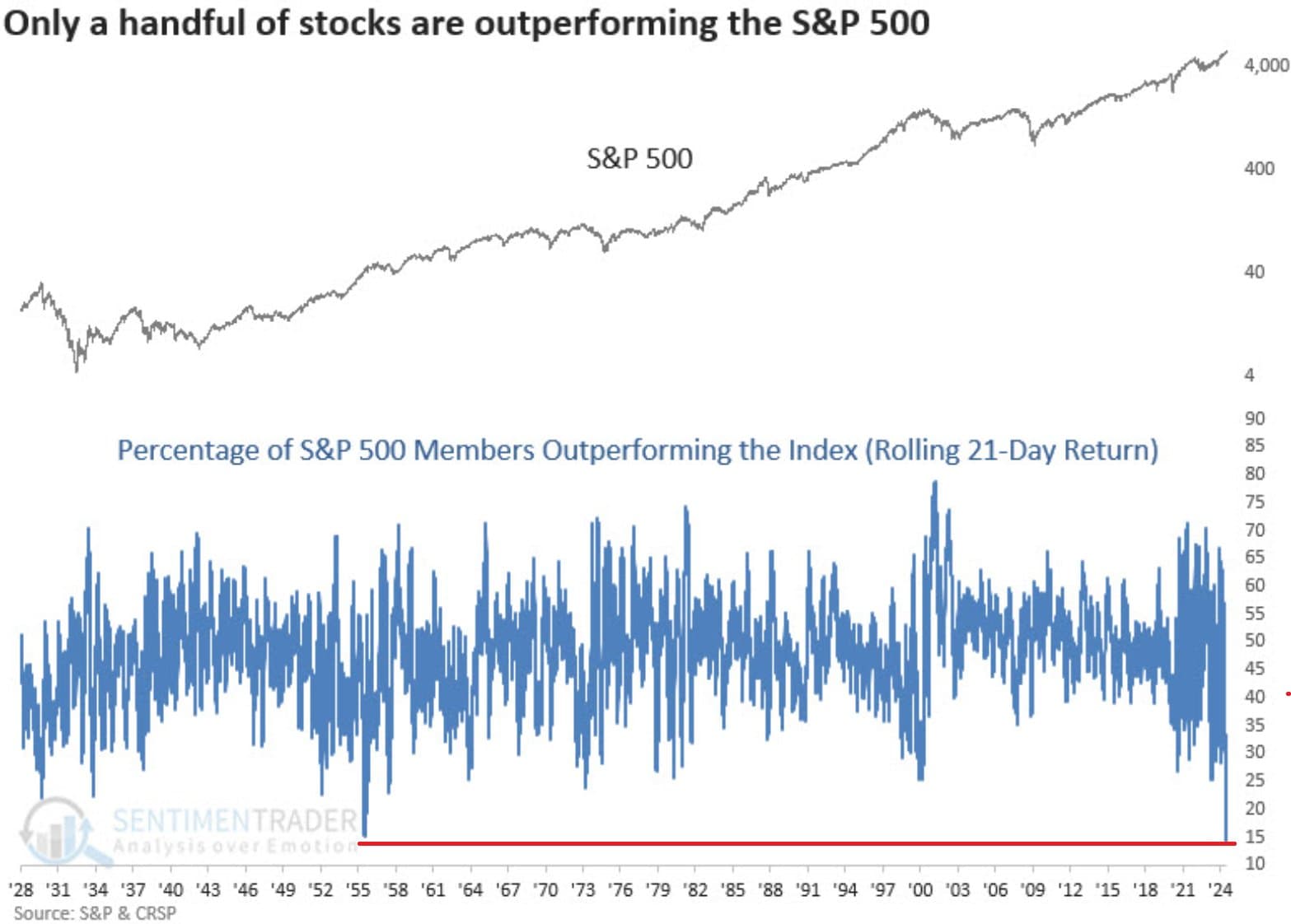 DƯỚI 15% cổ phiếu S&P 500 có hiệu suất tốt hơn chỉ số, tỷ lệ thấp nhất TỪ TRƯỚC ĐẾN GIỜ.