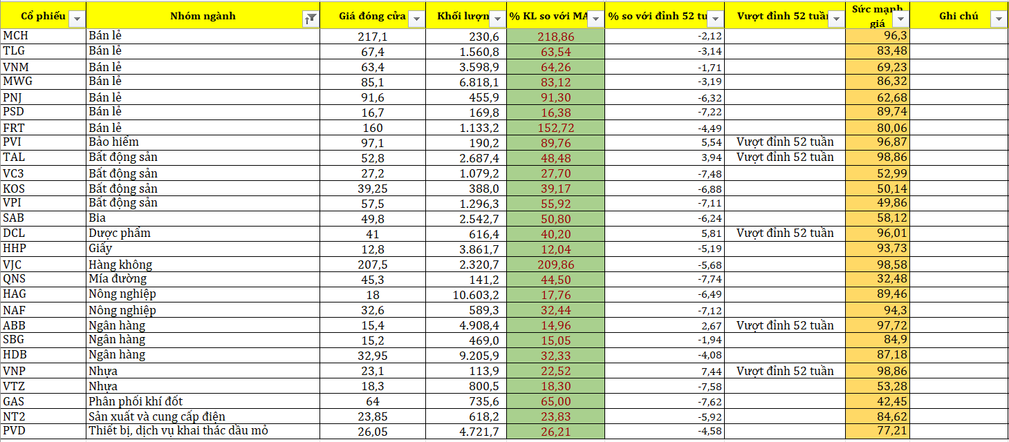 Danh sách những cổ phiếu quanh vùng đỉnh 52 tuẩn +/-10% cũng cho thấy nhóm bán lẻ đang đóng góp nhiều cổ phiếu ở danh sách này. Minh chứng cho sức mạnh giá như đã đề cập bên trên, với việc các cổ phiếu quay lại vùng đỉnh 52 tuần chuẩn bị bứt thoát hoàn toàn phù hợp với bối cảnh thị trường chung nhịp này đã thuận lợi để những cổ phiếu này đi lên.