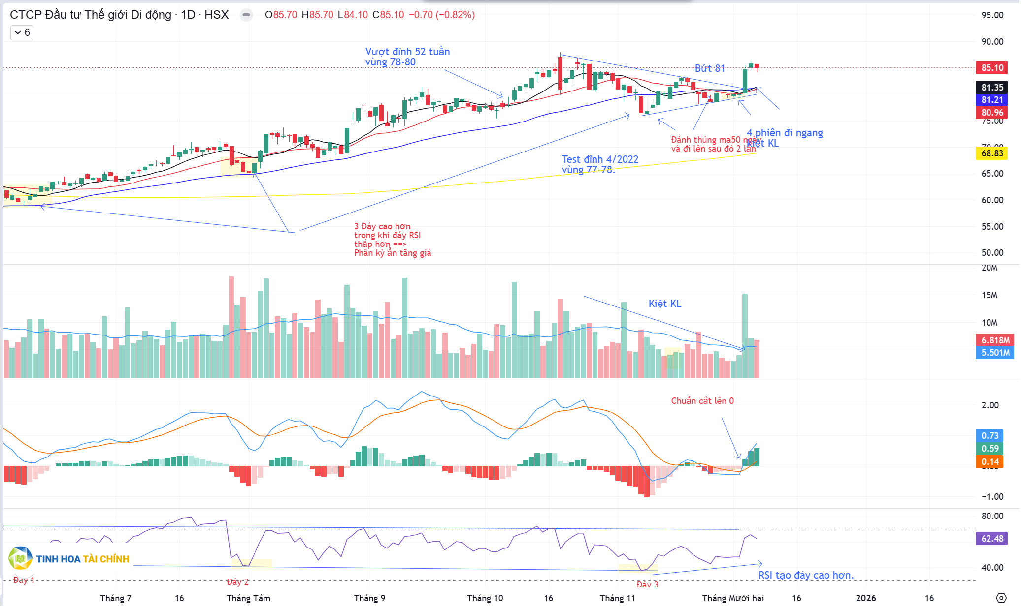 Đại diện nhóm cổ phiếu bán lẻ là MWG cho thấy rõ hơn về sự áp sát đỉnh 52 tuần, phiên ngày 3.12.2025 cổ phiếu đã bứt vùng 81 để thoát khỏi mẫu hình tam giác với 4 phiên kiệt khối lượng. Trước đó cổ phiếu có 2 lần đánh thủng ma50 ngày và lấy lại sau đó, điều này lý giải đơn giản là do điều kiện thị trường chung chưa thuận lợi. Đến thời điểm hiện tại thì khá rõ ràng nên việc cổ phiếu đi lên tiếp trong thời gian tới là điều dễ thấy.