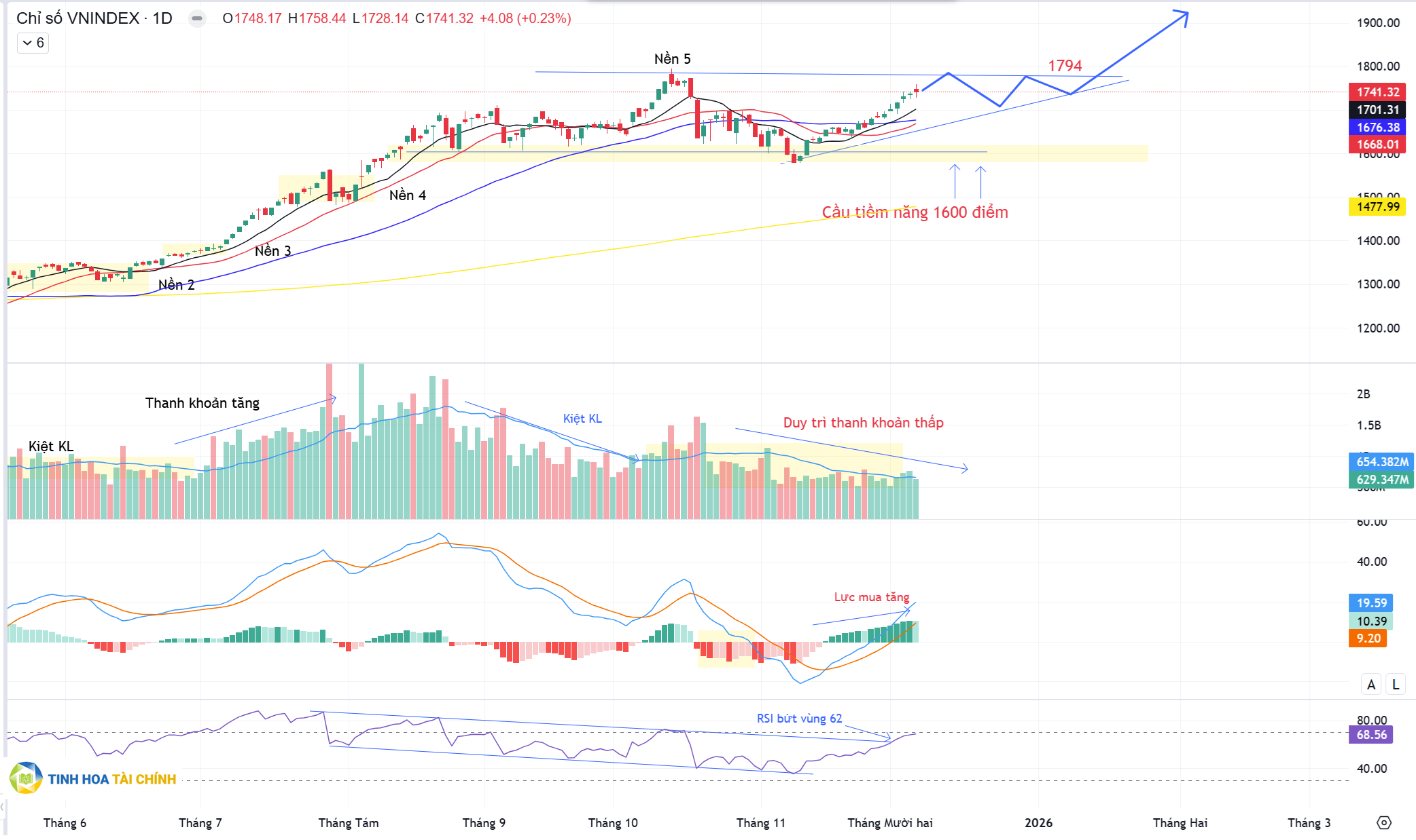 Như đã đề cập về đáy của thị trường nhịp 11.11.2025 ở bài viết: Thị trường đã có đáy, cổ phiếu dẫn dắt xuất hiện. Sau chuỗi 4 tuần tăng liên tiếp của thị trường đang đối diện với vùng có nguồn cung 1794 điểm. Với việc thị trường duy trì thanh khoản ở mức thấp thì nếu không có đột biến khối lượng thì thị trường khó vượt được vùng 1794 điểm, thay vào đó là vùng rung lắc hấp thu nguồn cung.