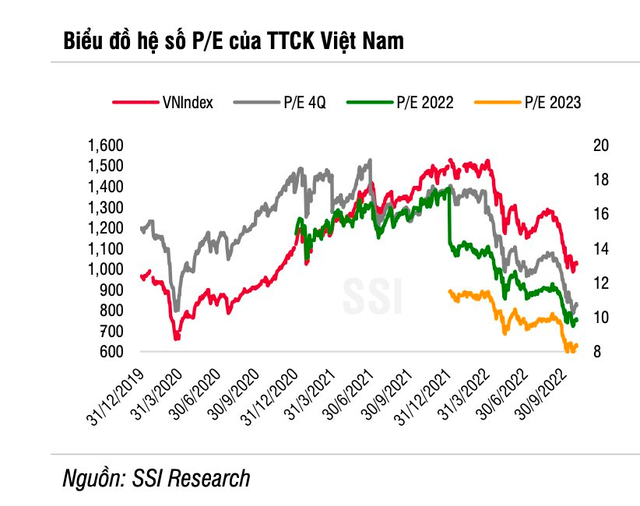 TTCK Việt Nam đã giảm 31,3% điểm số kể từ đầu năm và mức giảm của hệ số P/E ước tính năm 2022 của chỉ số VN-Index cũng tương đương ở mức 31,4%.