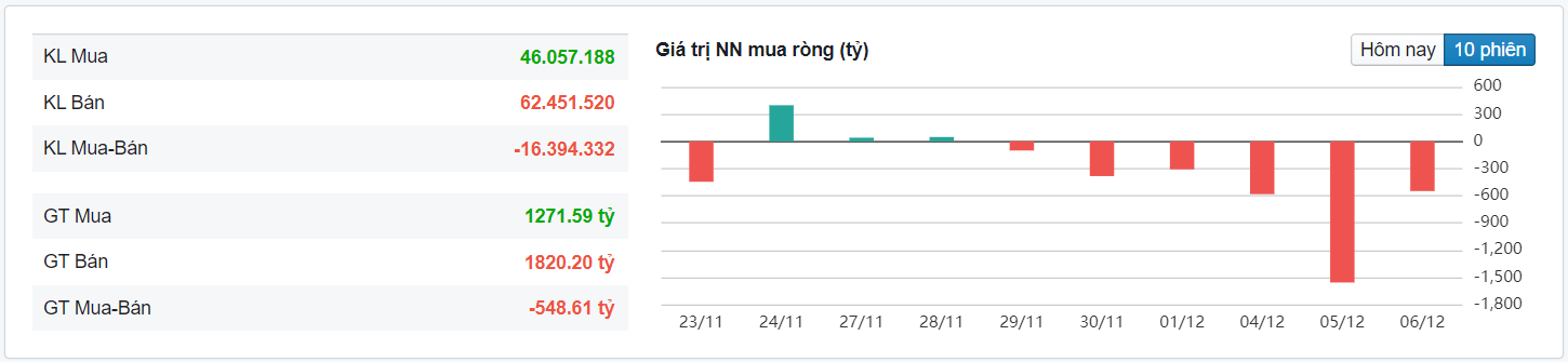 - Khối ngoại đã liên tục bán ròng 6 phiên gần đây. Phiên 6/12, giá trị bán ròng đạt gần 550 tỷ đồng, chủ yếu là lực bán các cổ phiếu như VHM VNM STB VND…