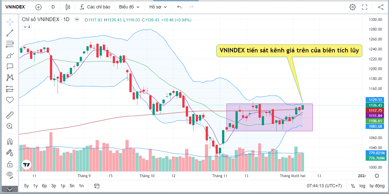 - Phiên 6/12, thị trường đóng cửa tại mốc 1126, rất sát với vùng kháng cự 1130 – kháng cự kênh giá trên của vùng tích lũy.