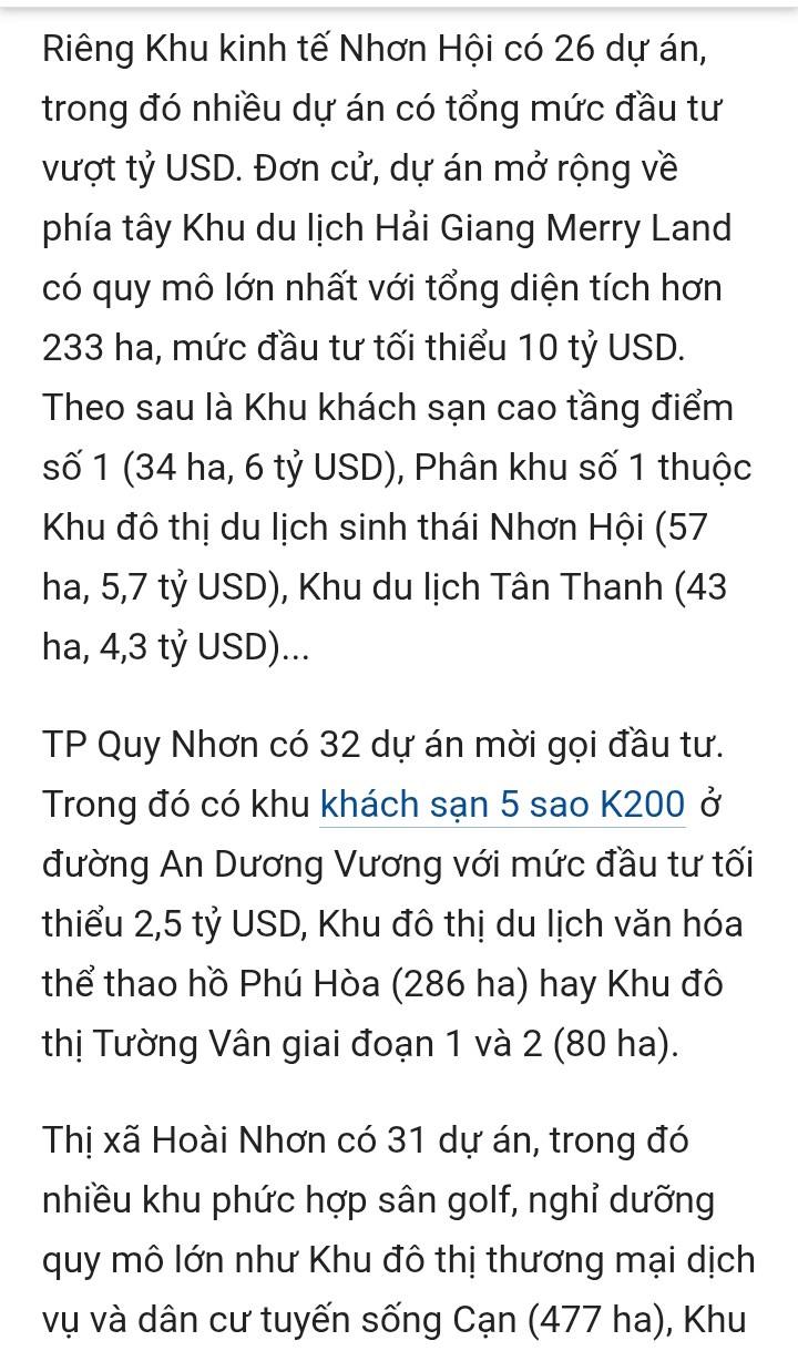 300ha Quy nhơn giai đoạn 1 → rồi có ngay quần thể Quy nhơn 20k tỷ - 1300ha, 20k tỷ thì bây giờ xúc nổi bao nhiêu biệt thự ở đấy, trong khi tiền cứ tiến đến vô cùng, năm nay độ 2.5 triệu tỷ, rồi mỗi năm túc tắc hàng triệu tỷ bung ra kkk