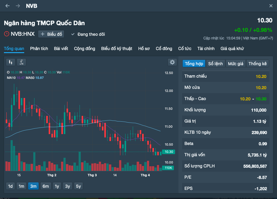 Năm 2024, theo tài liệu đại hội cổ đông, ngân hàng này không đưa ra con số cụ thể mà thông tin cam kết dùng toàn bộ nguồn thu để thực hiện phương án tái cơ cấu. Về giá cổ phiếu, kết thúc phiên giao dịch ngày 9-4, giá cổ phiếu NVB tăng nhẹ lên 10.300 đồng/cổ phiếu.