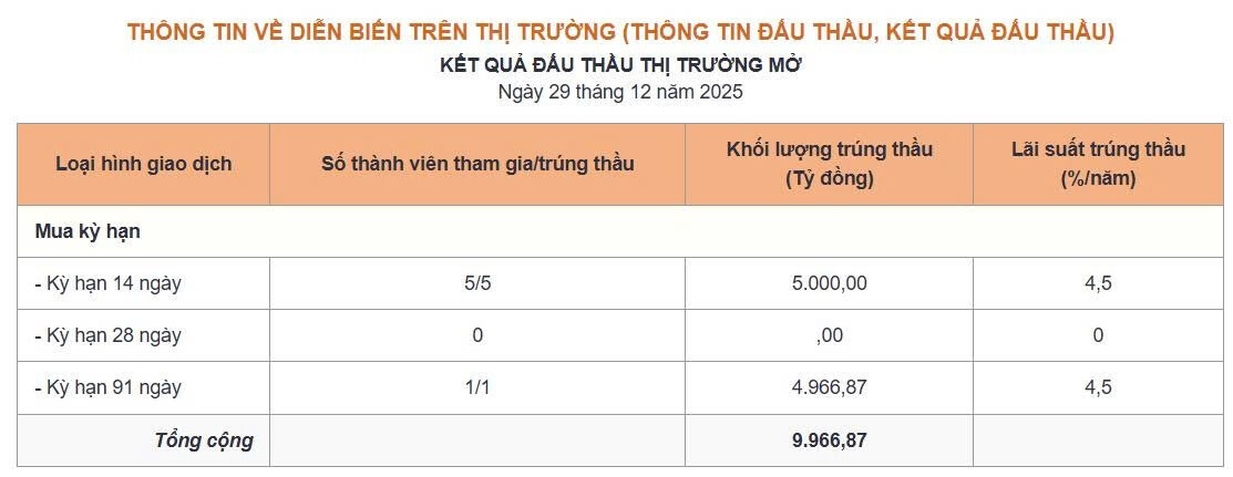OMO 91 ngày: 4.966,87 tỷ đồng (Lãi suất 4,5%)
