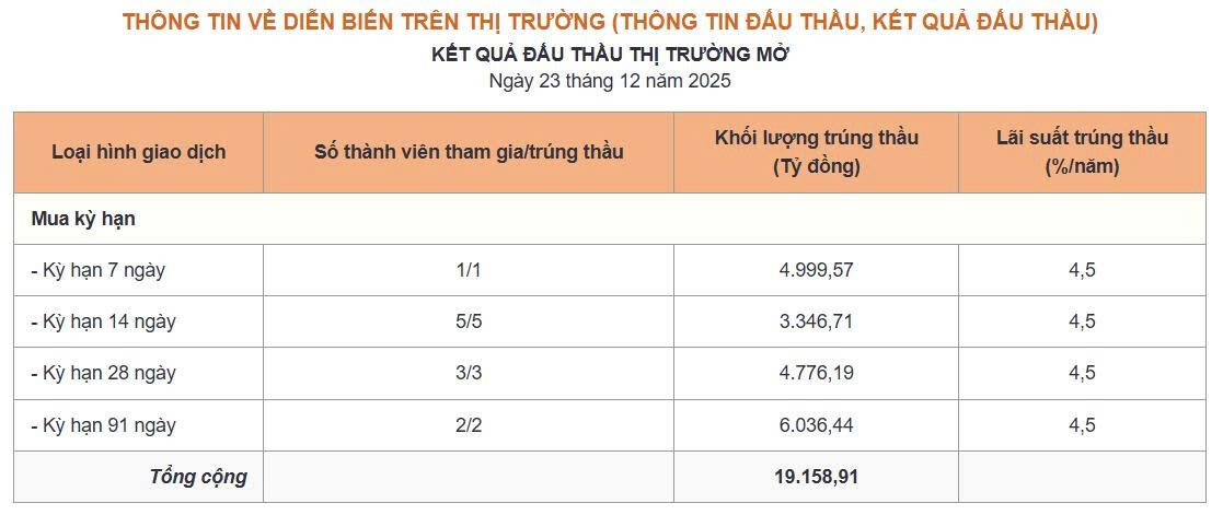 OMO 14 ngày: 8.095,31 tỷ đồng (Lãi suất 4,5%)