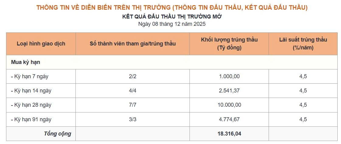 Thông tin thị trường mở ngày 8/12/2025: