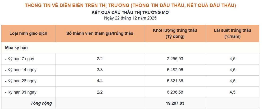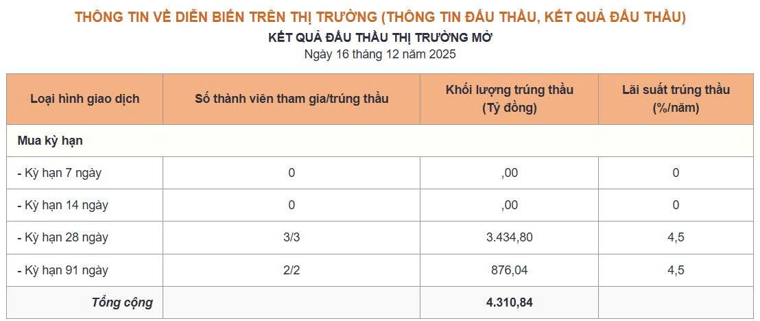 OMO 14 ngày: 14.375,29 tỷ đồng (Lãi suất 4,5%)