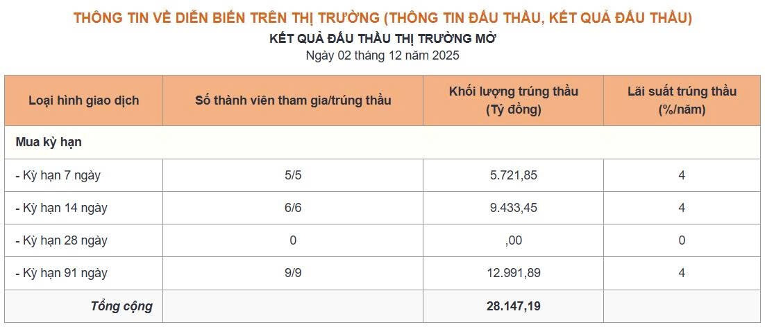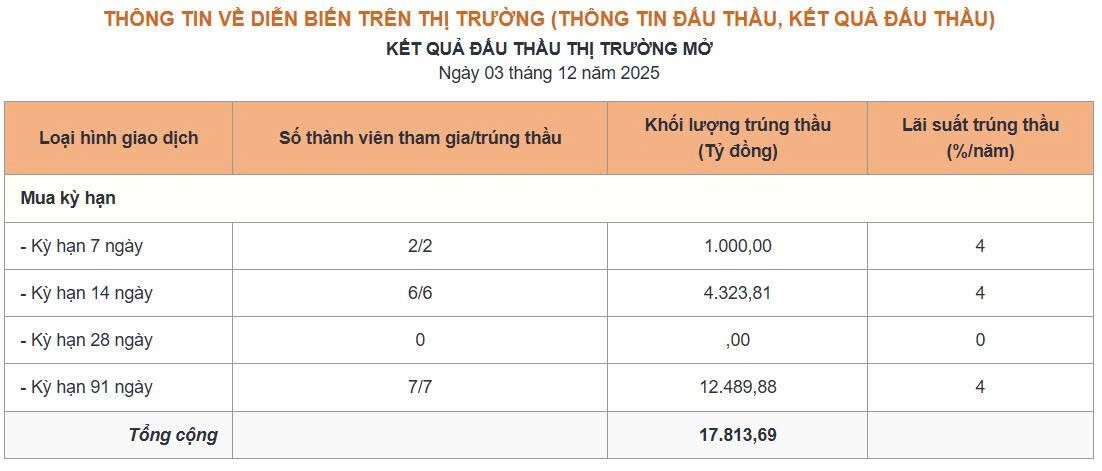 Thông tin thị trường mở ngày 3/12/2025: