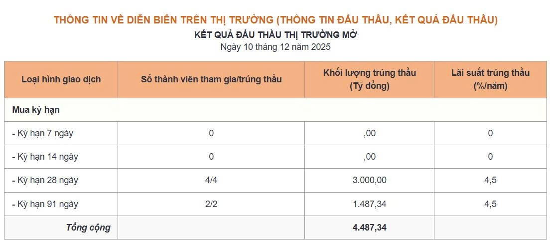 Thông tin thị trường mở ngày 10/12/2025: