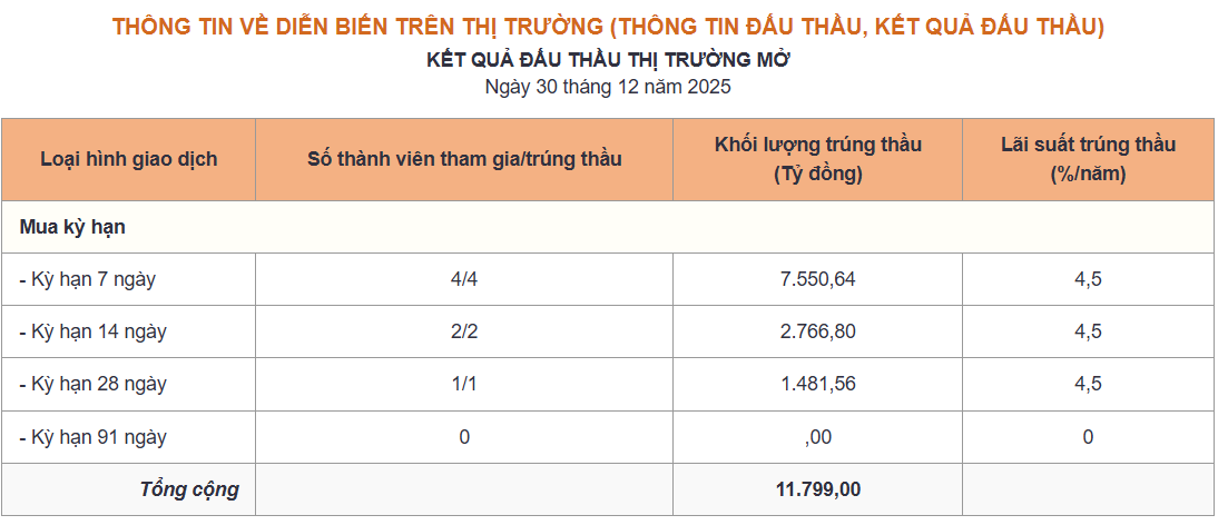 OMO 91 ngày: 6.236,58 tỷ đồng (Lãi suất 4,5%)