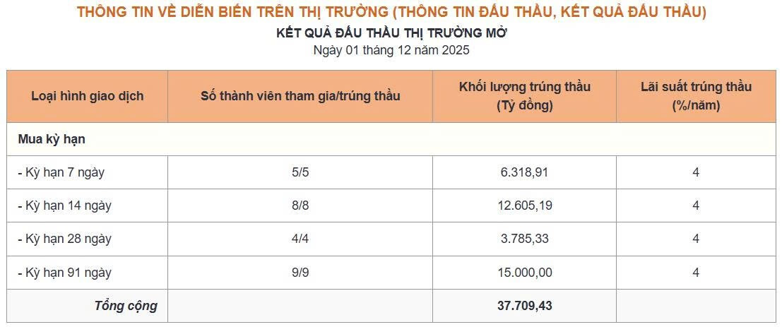 Thông tin thị trường mở ngày 1/12/2025: