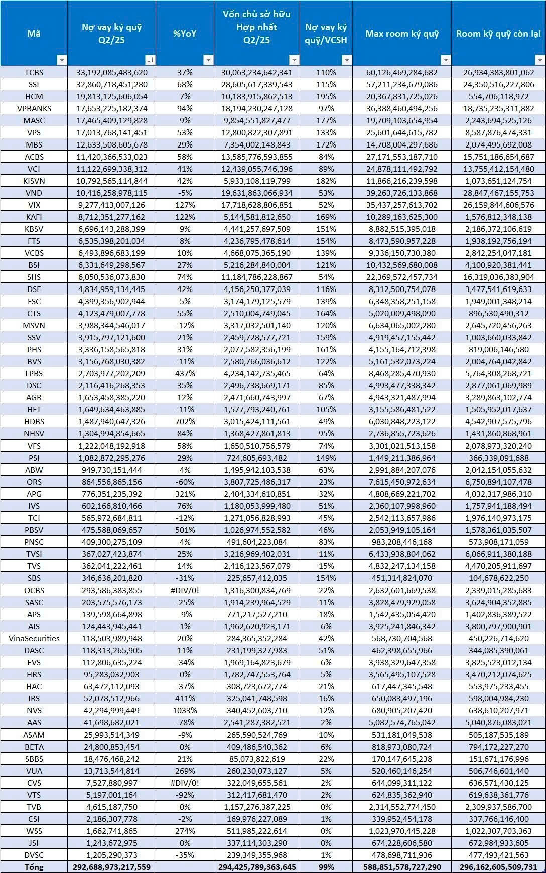 Theo quy định, mỗi công ty chứng khoán chỉ được phép cho vay margin tối đa gấp 2 lần vốn chủ sở hữu. Thống kê tổng hợp cho thấy dư địa cho vay còn lại (tỉ lệ giữa dư nợ hiện tại với giới hạn tối đa) đã giảm về mức 45,6%, thấp nhất kể sau quý 2-2022 và giảm gần 3 điểm phần trăm so với quý trước.