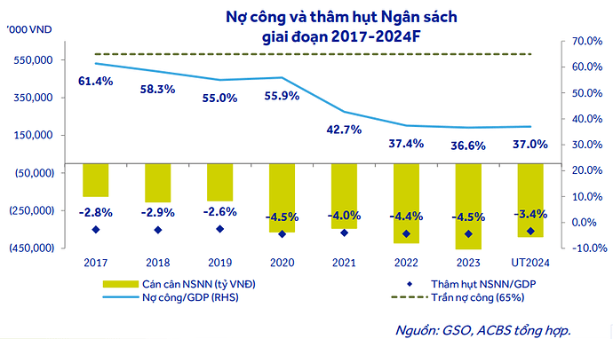 Theo ACBS, nợ công và thâm hụt ngân sách giai đoạn 2017-2024 đang ở mức thấp kỷ lục trong 10 năm khi chỉ ở mức 37%, điều này đồng nghĩa với việc có thể gia tăng nợ để tiếp tục đẩy mạnh đầu tư nội địa để mở khóa cho chu kỳ tăng trưởng 2025-2030 và tầm nhìn 2030-2035. Dư địa chính sách chính là lực đẩy rất lớn để Việt Nam vươn mình trở thành nước đang phát triển, có công nghiệp hiện đại, thu nhập trung bình cao đến năm 2030 và trở thành nước phát triển, thu nhập cao tầm nhìn đến 2045.