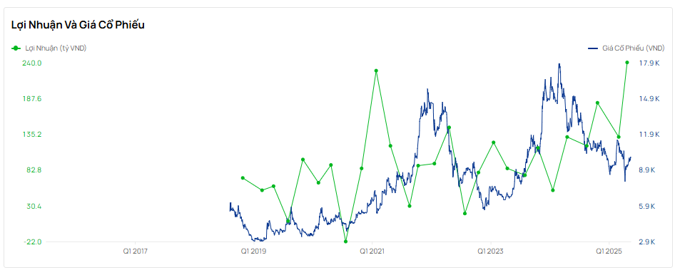 Giá cổ phiếu EVF (EVNFinance) thường vận động “trễ pha” so với trục tăng trưởng lợi nhuận (Nguồn: Vietcap)