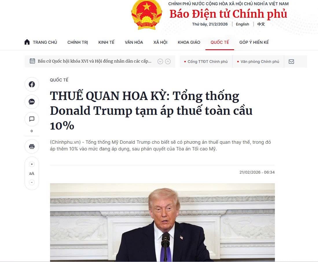 - Tổng thống Mỹ Donald Trump cho biết sẽ có phương án thuế quan thay thế, trong đó áp thêm 10% vào mức đang áp dụng, sau phán quyết của Tòa án Tối cao Mỹ.