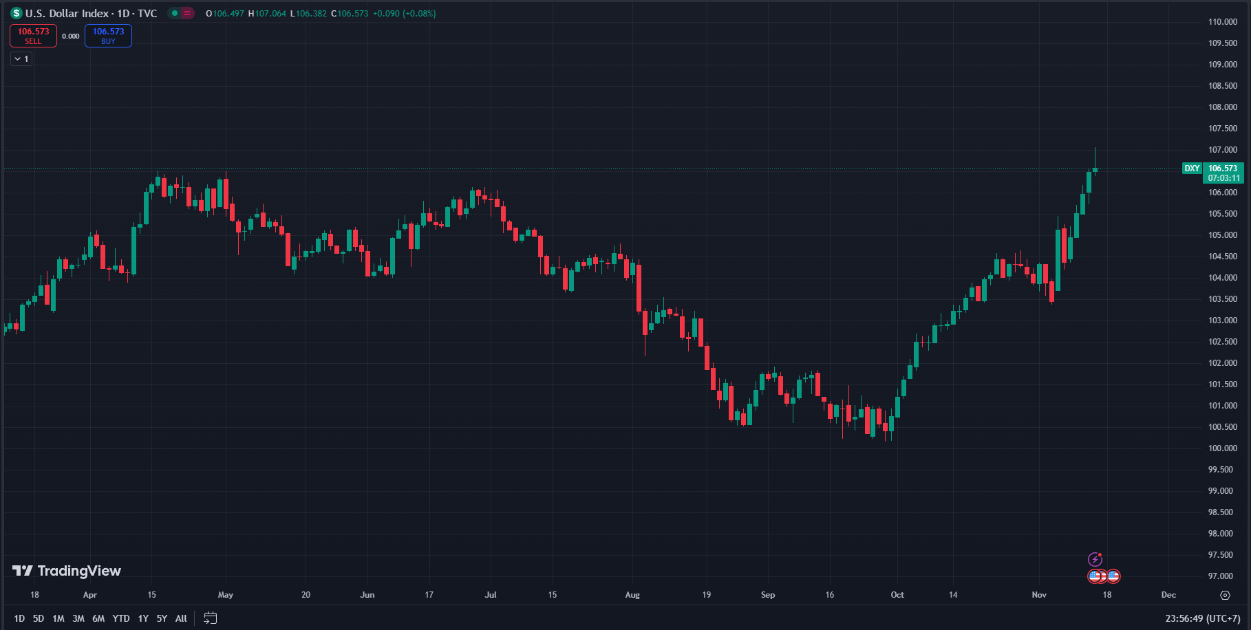 Xác định rõ lý do chính khiến NN liên tục bán ròng khỏi TT cũng một phần đến từ câu chuyện tỷ giá, DXY giai đoạn vừa qua liên tục tăng khá nóng, đặc biệt sau câu chuyện ông Trump, hiện nay đang ở mốc 106.5-106.7 và đang test đỉnh cũ 107.
