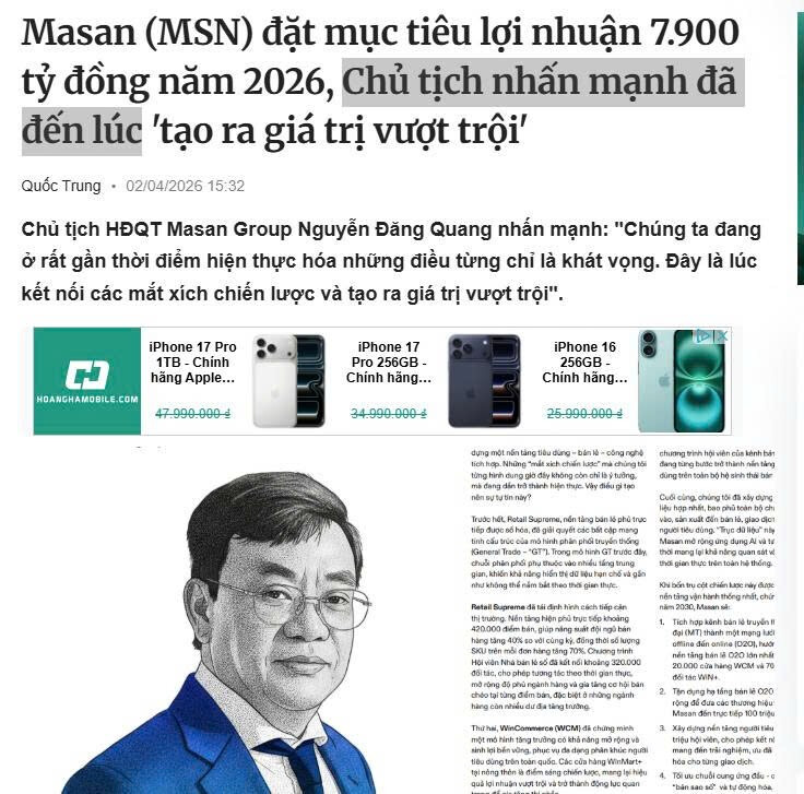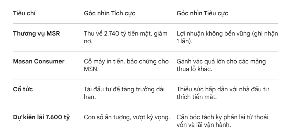 Lợi nhuận đến từ “thu nhập một lần”: Khoản thu từ việc thoái vốn MSR (chiếm hơn 1/3 dự kiến lợi nhuận năm) thực chất là lợi nhuận bất thường, không đến từ hoạt động kinh doanh cốt lõi hàng ngày. Nếu loại bỏ khoản này, tăng trưởng thực tế từ vận hành (Core Operating Profit) của MSN có thể không quá đột biến như con số tổng thể 7.900 tỷ đồng.