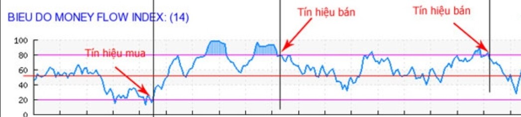 - Tín hiệu MUA: khi MFI đi từ dưới vùng quá bán và cắt lên trên đường 20. Vào lệnh khi MFI vừa cắt lên trên đường 20.