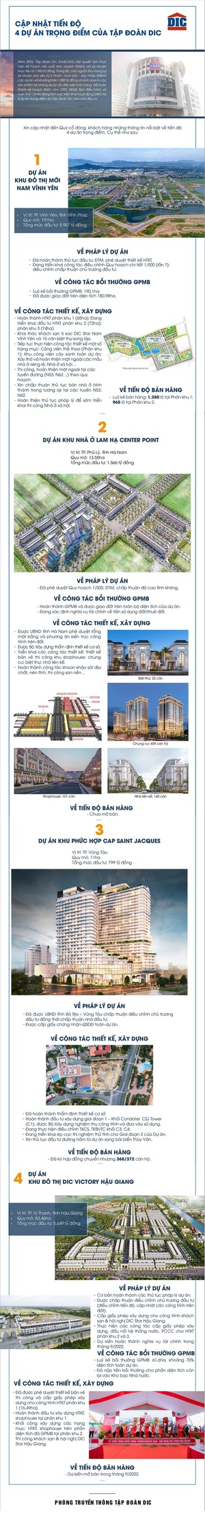 Hậu Giang giai đoạn 1: Với quy mô 83,46ha, Khu dân cư thương mại Vị Thanh là 1 trong 4 dự án trọng điểm của Tập đoàn DIC giai đoạn 2022 - 2025. Theo báo cáo kế hoạch sản xuất kinh doanh (SXKD) năm 2022 tại ĐHCĐ, dự án này dự kiến ghi nhận doanh thu: 1.049,74 tỷ đồng và lợi nhuận: 584,7 tỷ đồng trong năm 2022.