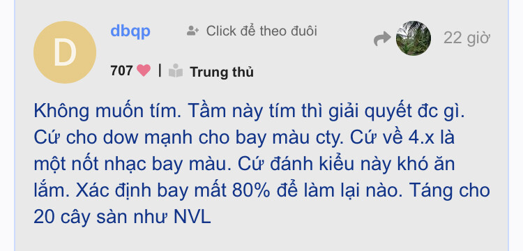mh gom vùng dưới 15,thậm chí trên 15 mh cũng nhặt,nên việc pht vs mh là ko có giá trị,còn ae khác xoay sở đc vốn để mua thêm hay ko thì tuỳ tài chính từng ng,nhưng bơm thêm 100tr cp thì chỉ khiến nó nặng mông trong giai đoạn này thôi,sao ko đợi tt ổn định r pht sau,ae cũng bớt phàn nàn hơn là hiện tại