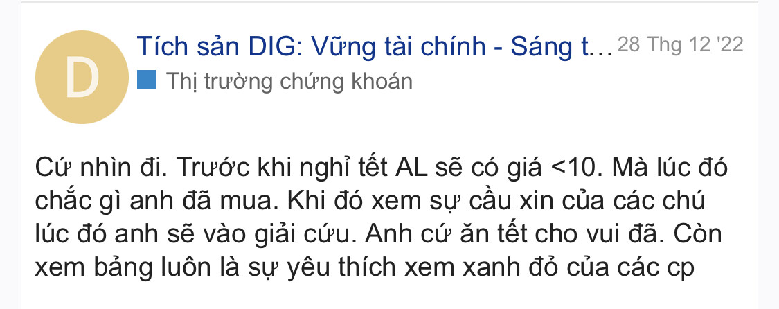Không viết thì thấy cu em gáy kinh quá. Mà cu em có biết đọc ko. Anh đã viết khi nào anh tham gia (back lại xem anh nhé). Tết đến nơi rồi đừng nặng quá lỗ lãi, nếu kỳ vọng thì múc mạnh đi em. Nếu tài thì cứ kiếm nhiều tiền để mang về cho mẹ. Đầu tư tính gì vài phiên cu em. Vui đi em, tầm này anh chỉ quất đào mai, tính gì xanh đỏ.