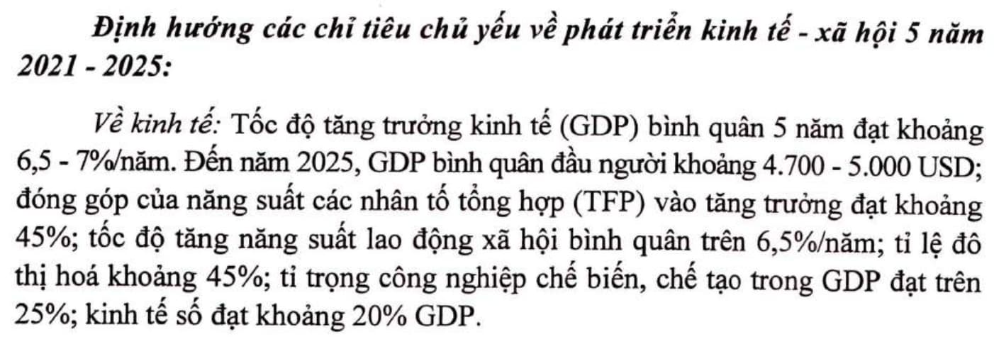 Nói về kinh tế, chỉ số tăng trưởng GDP luôn là ưu tiên số 01 trong dài hạn. Nghị Quyết Đại hội XIII, đặt chỉ tiêu 2021-2025, GDP khoảng 6,5-7%/năm