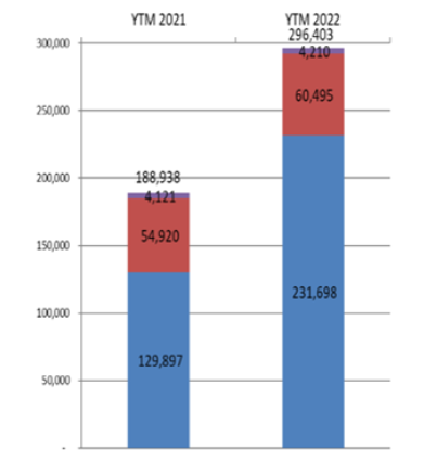 Tính chung 9 tháng năm 2022, các đơn vị thành viên VAMA có tổng doanh số bán hàng đạt 296.403 xe các loại, tăng 57% so với cùng kỳ năm trước. Trong số này có 231.698 xe du lịch, tăng 78%; 40.495 xe thương mại, tăng 10%; và 4.210 xe chuyên dụng, tăng 2% so với năm 2021.